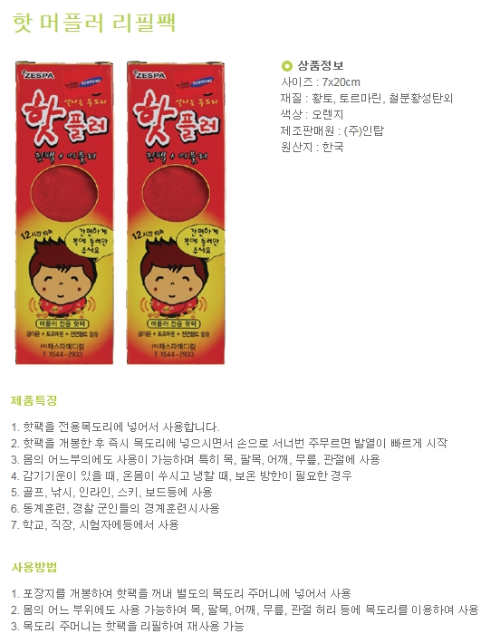 핫팩을 전용목도리에 넣어서 사용합니다.