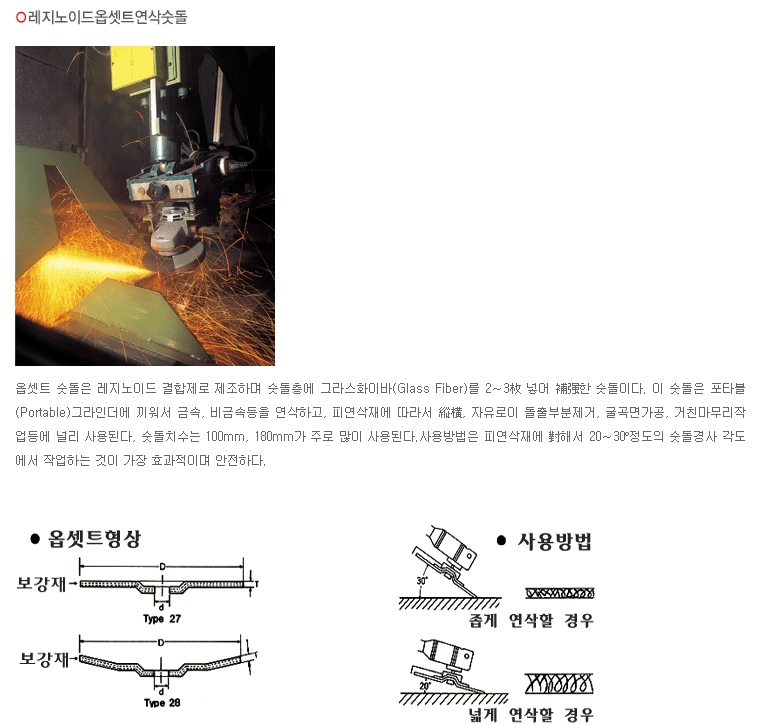옵셋트 숫돌은 레지노이드 결합제로 제조하며 숫돌층에 그라스화이바