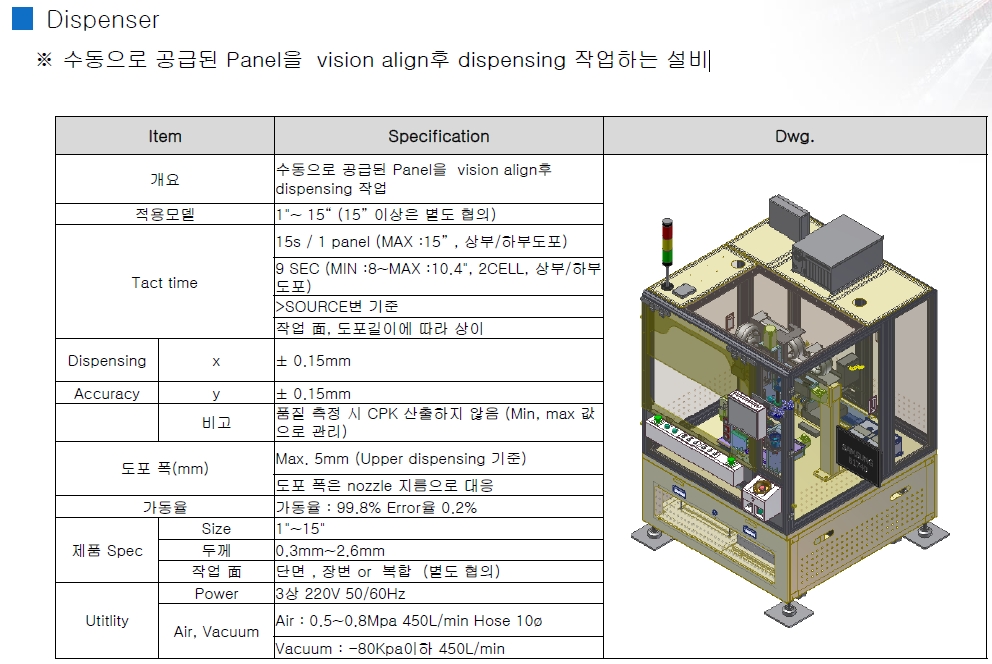 수동으로 공급된 Panel을 vision align후 dispensing 작업하는 설비