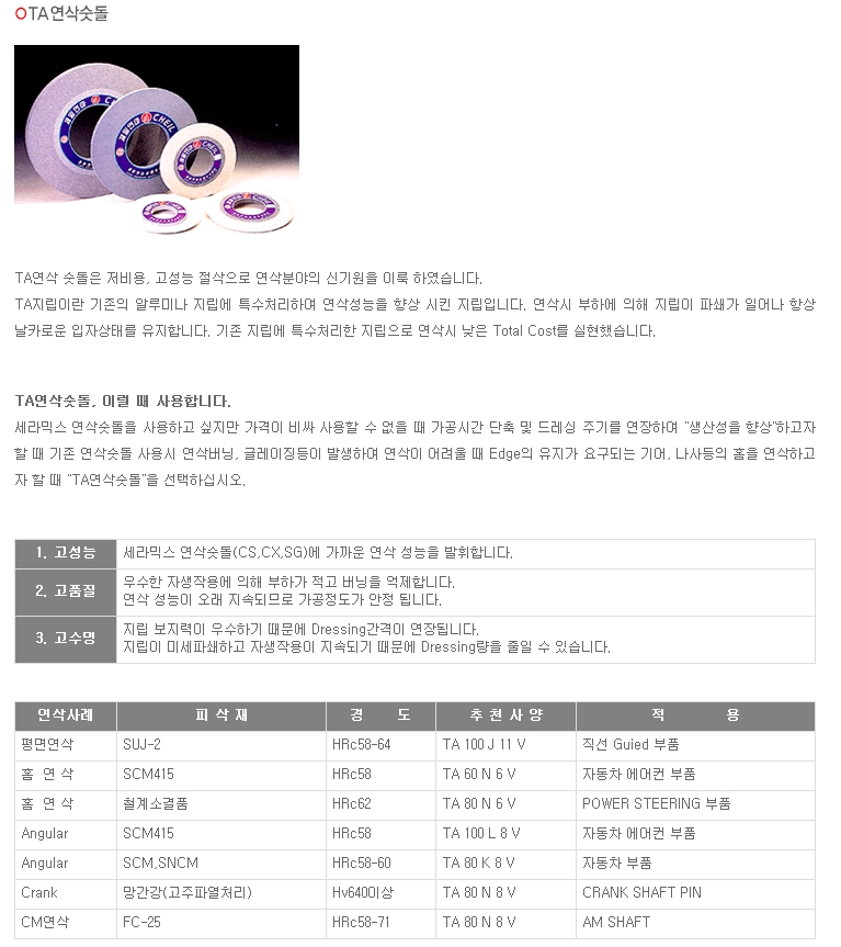 TA연삭 숫돌은 저비용, 고성능 절삭으로 연삭분야의 신기원을 이룩 하였습니다