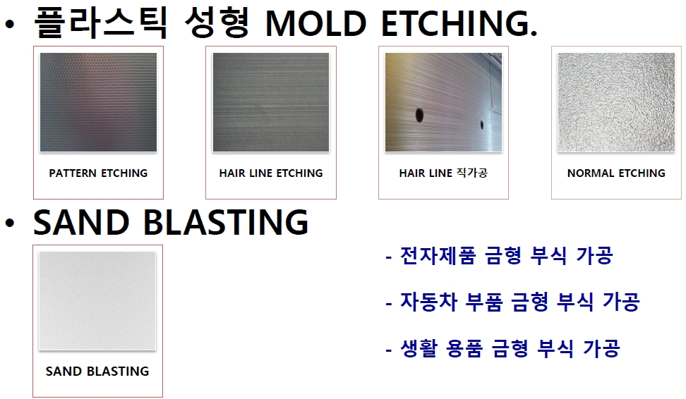 금형부식(에칭) 전문업체로서 금속부식(금형샌딩,헤어라인부식)을