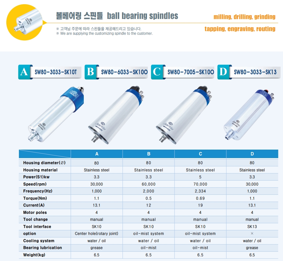 볼베어링 스핀들,Ball bearing spindle,조각, 드릴링, 밀링, 드릴링, 탭핑 등 공작기계용 스핀들